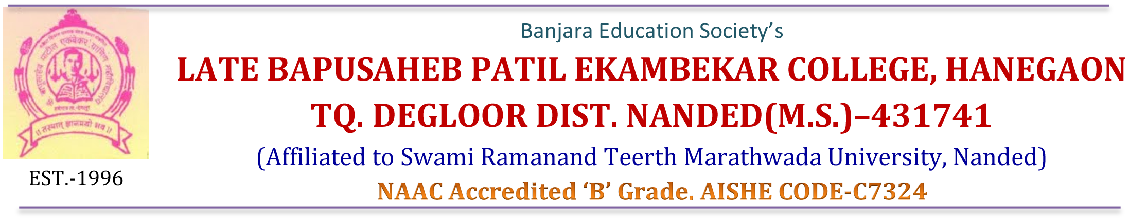 Late Bapusaheb Patil Ekambkekar College, located in Hanegaon, Tq. Degloor, Dist. Nanded, is a well-established institution managed by the Banjara Education Society. The college is uniquely positioned at the confluence of three state borders—Maharashtra, Karnataka, and Telangana—making it accessible to students from diverse backgrounds.